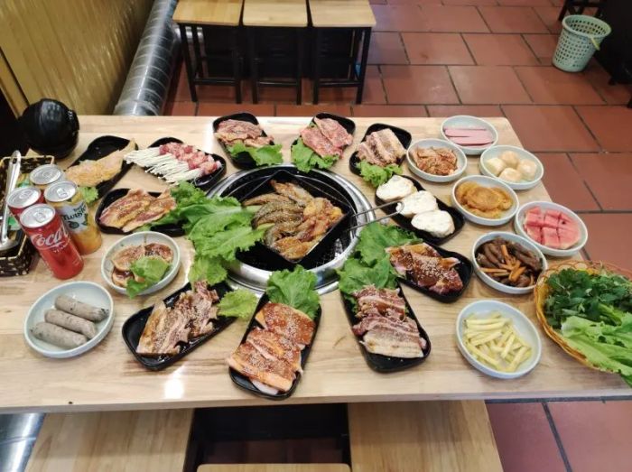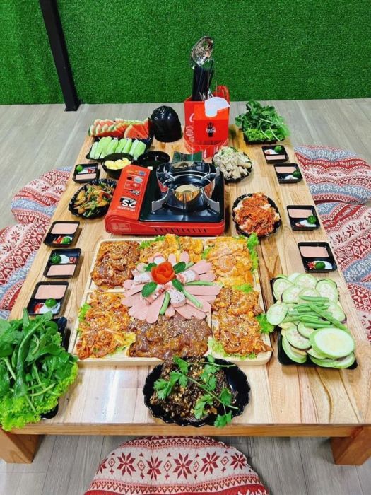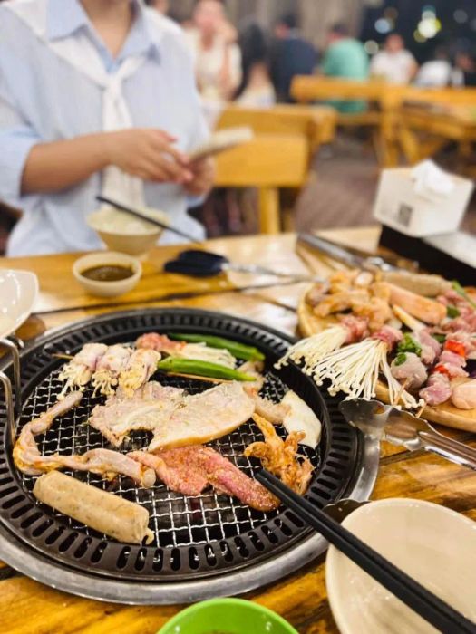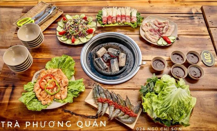 BBQ Tra Phuong Quan is known for its signature grilled meats, including American ribs (belly, mushroom-wrapped ribs, beef brisket, tenderloin), Australian beef shoulder, various cuts of pork (Korean neck, belly, shoulder, intestines), beef sausages with shiitake mushrooms, five-spice skewers, goose breast, and grilled seafood like butter-baked oysters and octopus. The restaurant also serves delicious hot pots like Thai and kimchi stews. The romantic and cozy ambiance transports you straight to Korea, where you can enjoy a bottle of soju on the balcony as if you're part of a K-drama. All the ingredients are fresh, grilled at your table without smoke, and accompanied by unique dipping sauces, all at wallet-friendly prices!