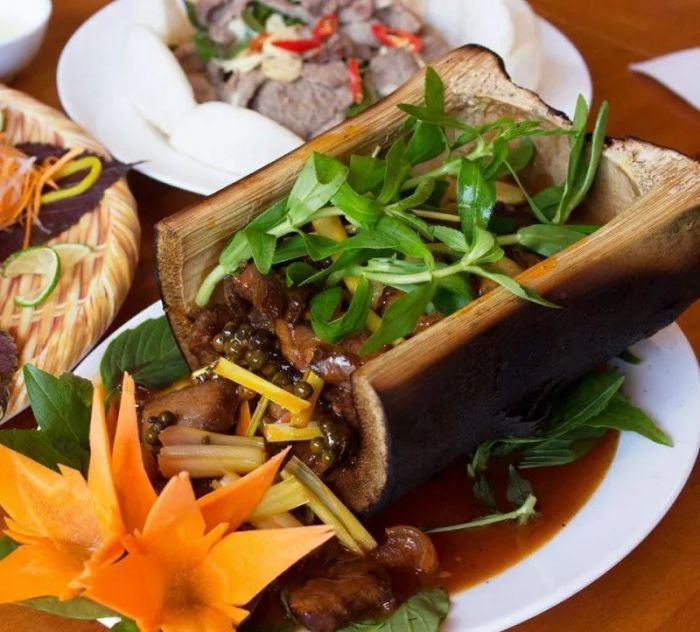 Gia Bao Restaurant - Grilled Tile offers a unique and exciting dining experience with its signature grilling technique using tiles. On the chilly evenings of Sapa, sitting next to a glowing charcoal stove with a tile placed on top to grill various meats like goat, beef, and pork, as well as seafood, marinated with bold, flavorful spices, creates a satisfying, nostalgic yet innovative experience that will excite your taste buds. The use of tiles ensures the meat cooks evenly without burning, providing a memorable and special experience for all meat lovers!