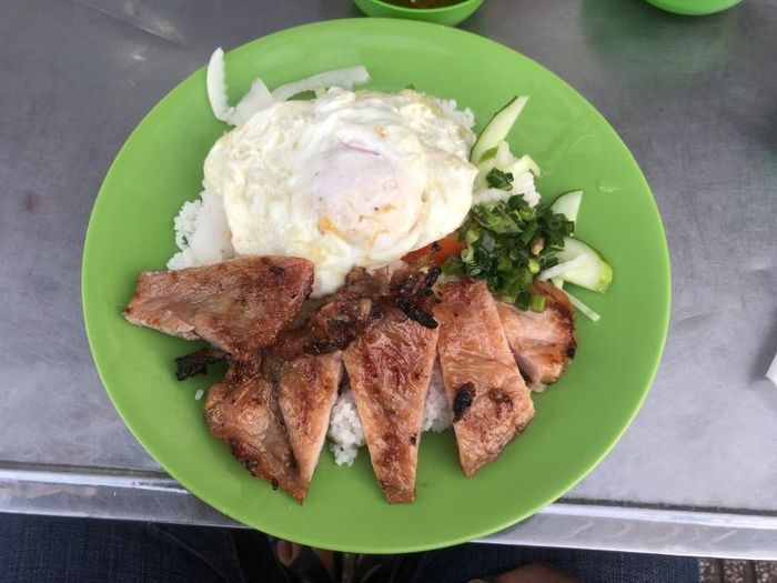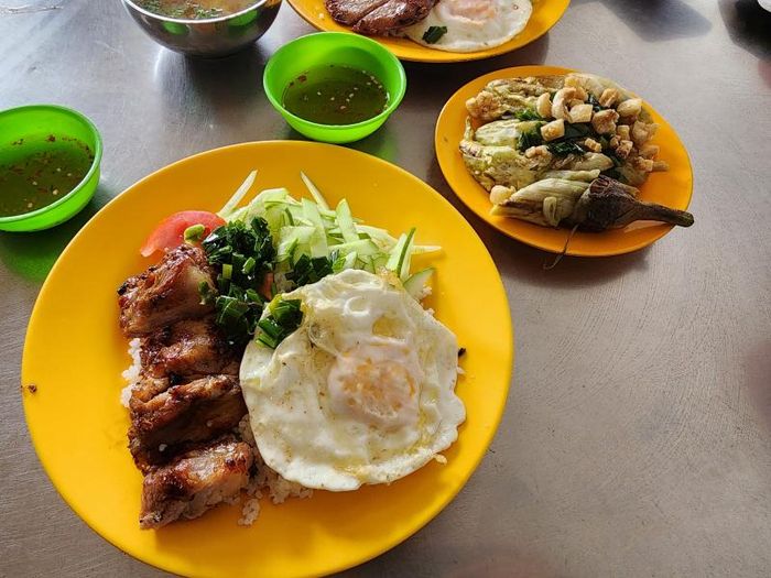 Cầu Đôi Broken Rice offers two different menus: one for lunch and another for dinner. At lunchtime, you can choose from five set meal options that include white rice, one of more than 12 daily dishes, a soup, and a variety of beverages. For dinner, the restaurant innovates by offering a unique fusion of broken rice and mixed rice dishes. This innovative pairing creates a harmonious balance of savory, sour, spicy, and bitter flavors, especially with their grilled pork ribs. The combination of the marinade, dipping sauce, and tomatoes creates a delightful and well-rounded taste.