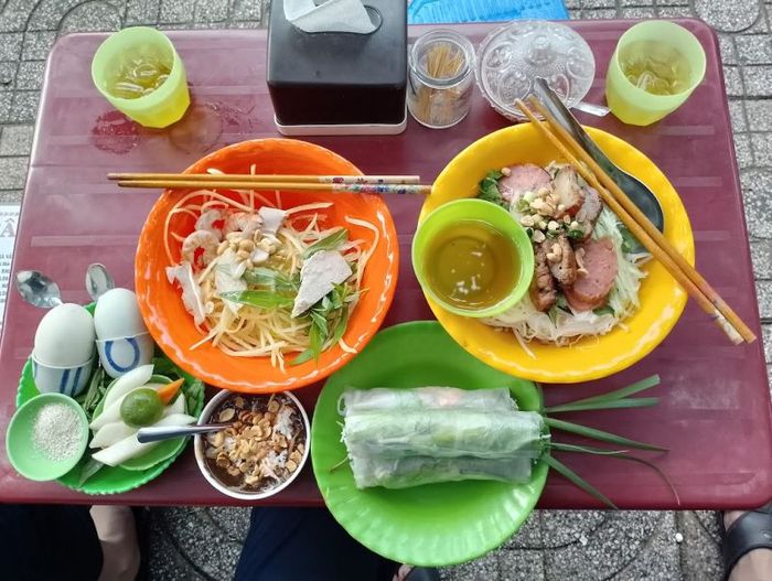 The savory bánh bèo is typically topped with mung beans, shredded pork skin, and crispy fried dough cubes, garnished with fried shallots. The sweet version is irresistible with its rich coconut milk fragrance, offering a flavor that melts in your mouth and leaves a lasting impression. Enjoying these fresh bánh bèo in the late afternoon, with a bowl of flavorful fish sauce and a side of sweet-sour pickled vegetables, turns any casual conversation into something much more memorable. If you’re looking to try it, head to Bánh Bèo Bì and experience a taste that will surely satisfy.