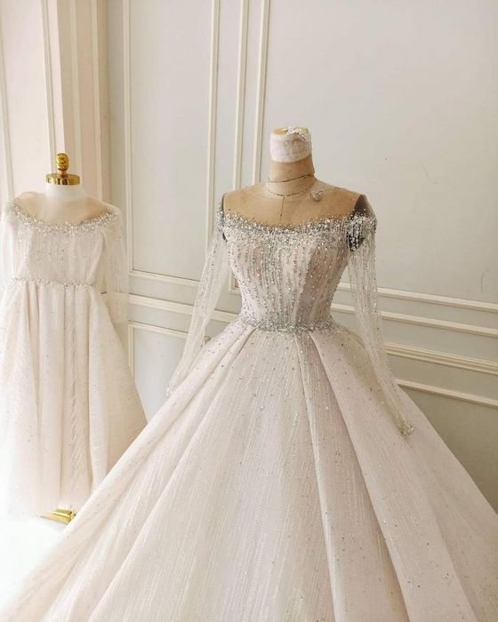 - Wedding dress adorned with stone patterns, sparkling sequins.