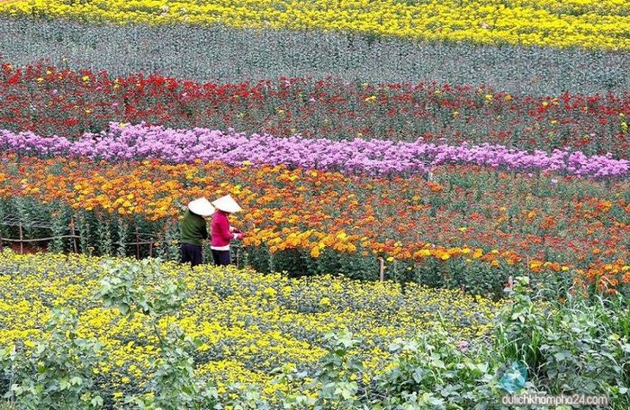 Although it doesn't have the long history of other flower villages like Ngoc Ha or Nhat Tan, Me Linh has flourished in the market economy. It has transformed from a region traditionally known for growing staple crops into a vibrant flower-growing hub. Fields of colorful flowers such as violets, gladiolus, mimosa, chrysanthemums, Da Lat roses, French roses, dahlias, and lilies have replaced the green of rice and vegetables, bringing new hues to the local landscape.