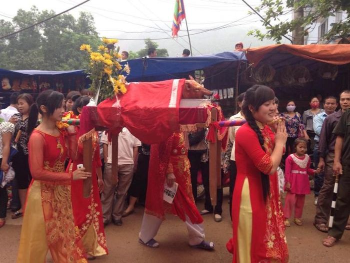 During the festival, not only local residents but also visitors from afar, as well as those who have moved away, return to join in the celebration, creating a lively and bustling atmosphere. After the vibrant procession, a solemn ritual honoring the deity Cao Sơn, who is worshipped here, takes place. The festival also includes a series of fun and exciting activities such as bridge-stealing contests, word-pulling games, swinging, tug-of-war, wrestling, and cockfighting. In addition, there is a traditional food contest where participants prepare dishes like sticky rice, pork, pig intestines, vegetables, pork bone soup, and more, drawing large crowds.