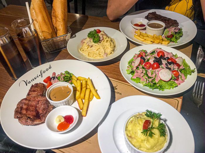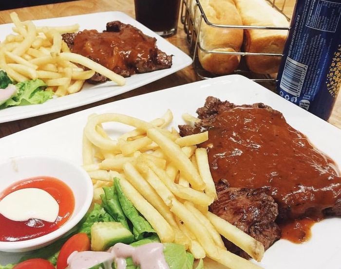 MOO Beefsteak offers a cozy and warm atmosphere. The restaurant not only serves steak but also offers a variety of other fast food dishes such as pizza, pasta, soup, and salad,... The menu here is highly praised for both the quality of the food and the presentation, which are delicious and visually appealing.