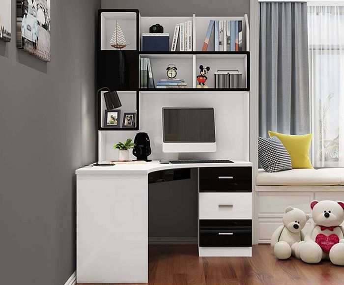 Here's a highly modern and functional study desk, perfect for children. This modern desk utilizes a combination of white and black tones, along with a built-in bookshelf and drawers, allowing children to conveniently store books and study materials. The L-shaped design adds a distinctive touch, enhancing user comfort.
