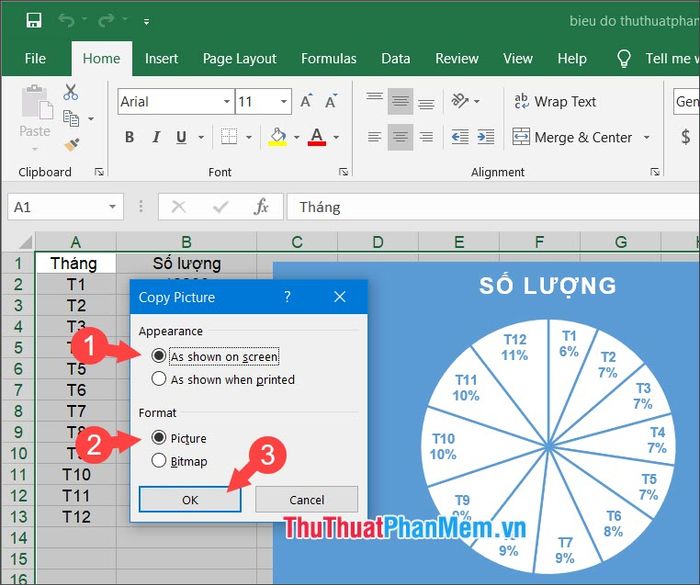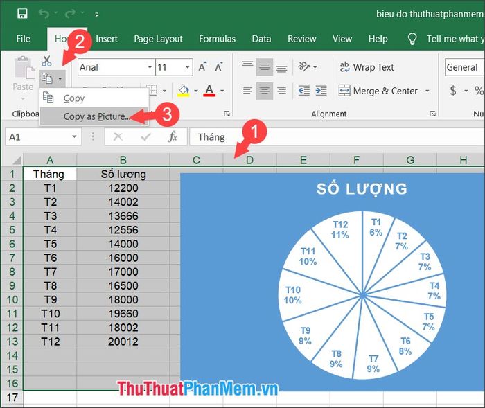 Step 1: Highlight the data in Excel (1) => Copy (2) => Copy as Picture (3).