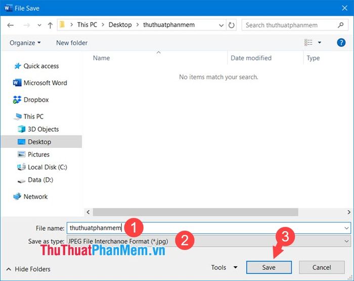 Next, locate the folder to save, and name the file (1) => select the image format (2) => OK (3).