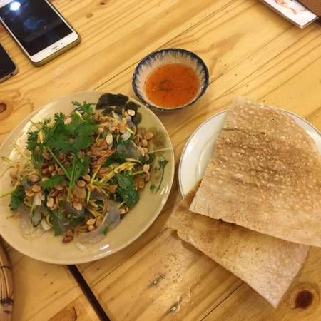 Jellyfish ear and jellyfish foot salads are dishes favored by many tourists visiting Binh Dinh. Jellyfish ear salad is made from squeezing jellyfish ears and mixing them with various spices, peanuts, green bananas, thinly sliced bitter melon, julienne green mango, and aromatic herbs such as coriander and basil. Creating jellyfish foot salad is more intricate as it involves mixing with chicken or pork, thinly sliced along with various types of chili, finely chopped mango, roasted peanuts, and other herbs. This dish is enhanced when dipped in shrimp paste.