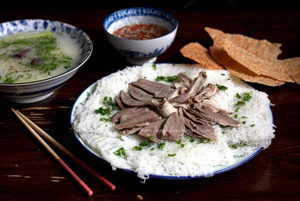 Rice vermicelli is a specialty of Bình Định, and in Quy Nhơn, you'll find numerous signs advertising pork heart congee and rice vermicelli. Although rice vermicelli and congee are distinct dishes, locals combine them to create a delightful treat. Rice vermicelli is a variation of fresh rice noodles, while the congee is cooked with a thin, blood-based broth, extracted from bones and pig hearts. The congee is both sweet and fragrant, and when enjoyed with a plate of skillfully-prepared pig hearts, it becomes an unusually delicious dish.