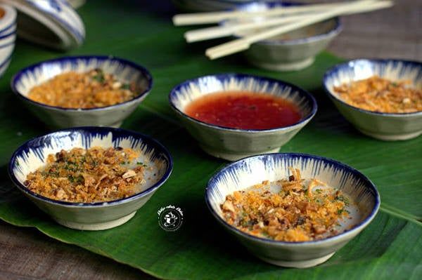 Mini pancakes in cups are made from rice flour, molded into small cup-shaped molds. Each Quy Nhon cupcake is only about 2 finger joints in diameter, with a large hole in the center, resembling a coin's concavity. Typically, a plate of mini pancakes contains around 10 small, adorable, white, fragrant rice cakes that are soft and not sticky. The chef then sprinkles shrimp powder, crushed peanuts, and chopped green onions on top, finishing with a dipping sauce and some crispy fried bread pieces.