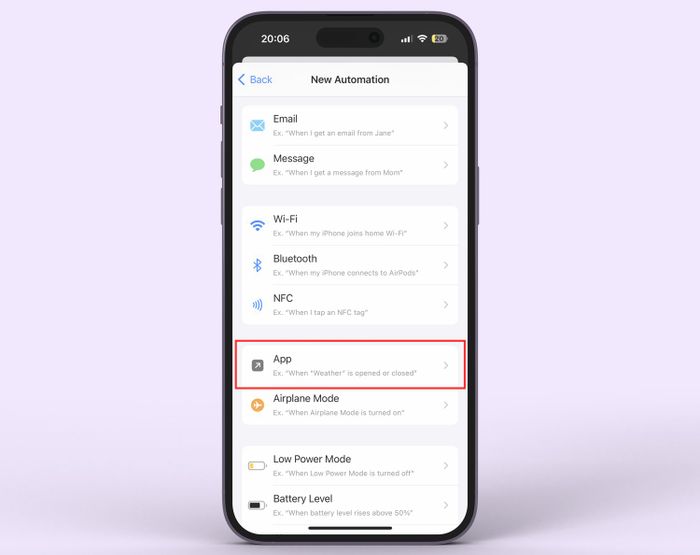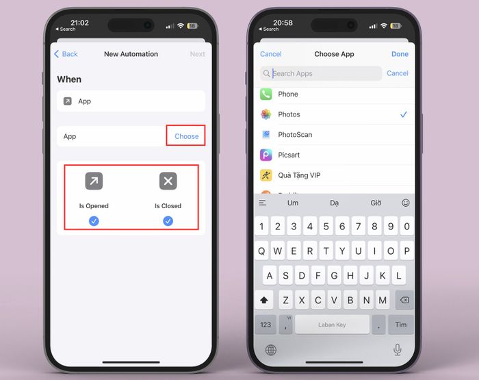 - Check both options “Is Opened” and “Is Closed” then tap Choose to select the app. For example, I choose Photos, then tap Done > Next