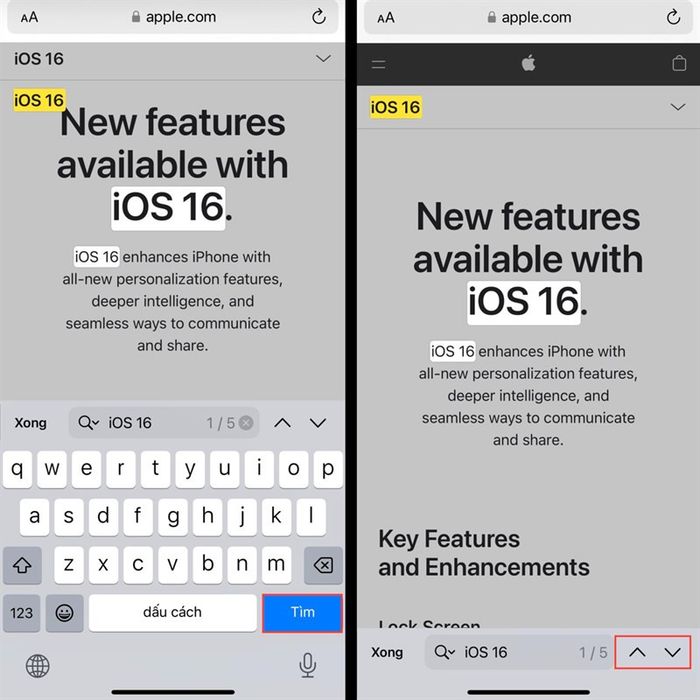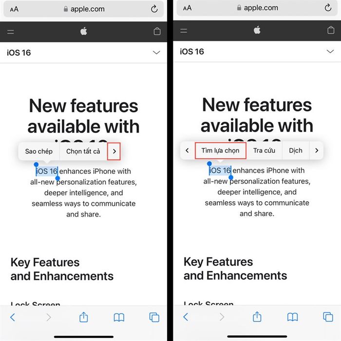 iOS 16 users need to open the Safari app, access the webpage they want to search for keywords, then long-press to highlight the keyword they want to find on the page. Next, users tap on the arrow on the taskbar, find and tap on 'Find in Page.'