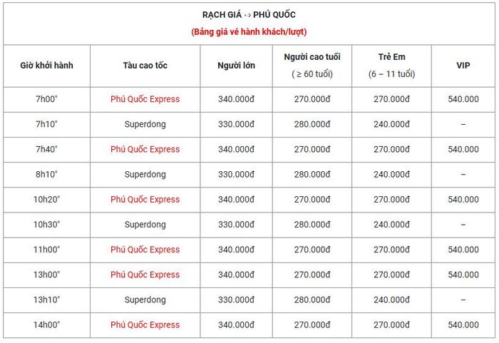 Upon arriving in Rach Gia, you'll need to transfer to the island by either Superdong or Phu Quoc Express ferry. Refer to the schedule and ferry ticket prices below: