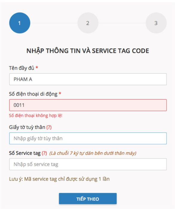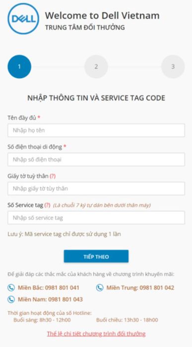 - Service Tag Number: a string of numbers corresponding to a Dell device code, managed by Dell Vietnam. When customers purchase promotional products, dealers' staff will guide customers to get the Service Tag number. Each Service Tag number can only be entered once.