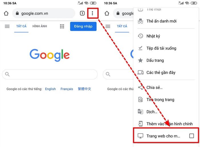 Step 2: After completing the installation of Google Chrome browser on your phone, at the top right of the screen, tap on the three-dot button. From the dropdown menu, select Desktop Site. Enter https://chat.zalo.me/ in the address bar to access the Zalo app.