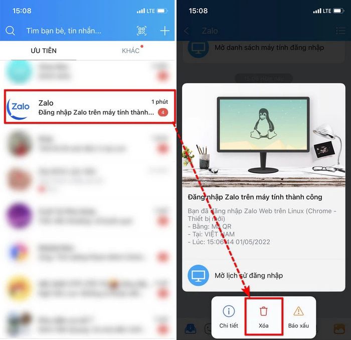 Step 5: To avoid detection by the other person that you've logged into their Zalo account, simply delete login notification messages from Zalo on their phone. Just tap on the Zalo notification message and then tap delete.