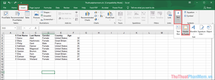 Step 1: Open the Excel file you want to watermark and select the Insert => Text => Header & Footer tab.