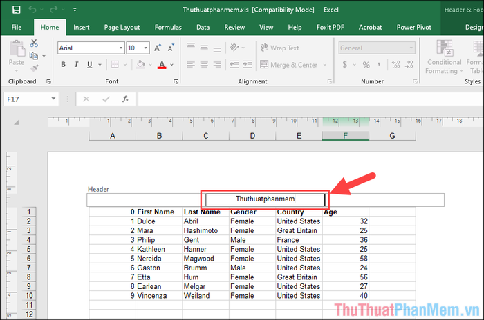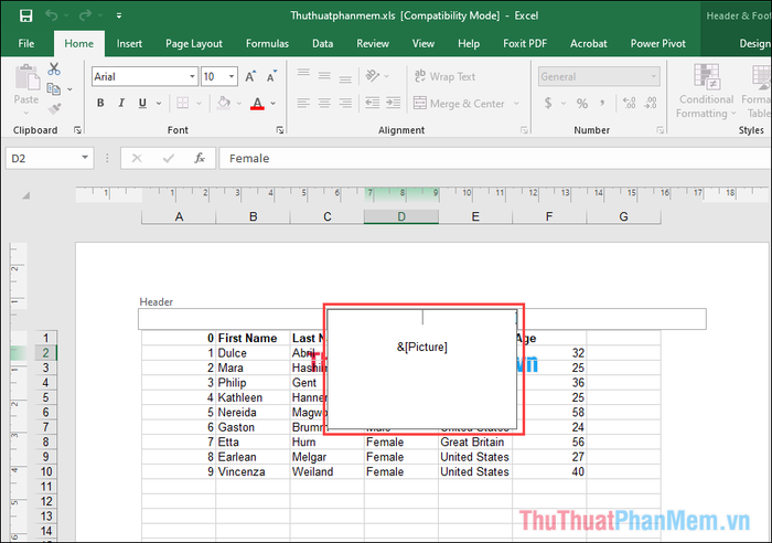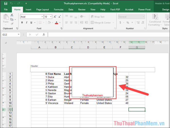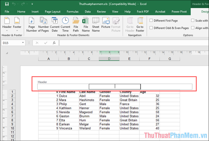 Step 2: On the main interface, a new line with the Header content will appear. The Header line consists of 03 columns, and click on the center cell to insert in the middle. If you want to place the watermark off-center, simply choose the left/right cell.