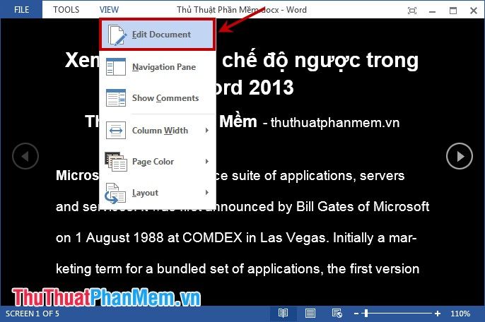 When you choose Inverse mode, the Word background will turn black and the text content will be white. To return to normal editing mode, select View -> Edit Document (or press the ESC key on your keyboard).
