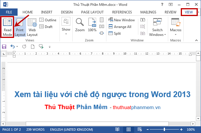 Step 1: On the Word 2013 interface, select the View tab on the Ribbon. Then, choose Read Mode under Views to activate reading mode in Word.