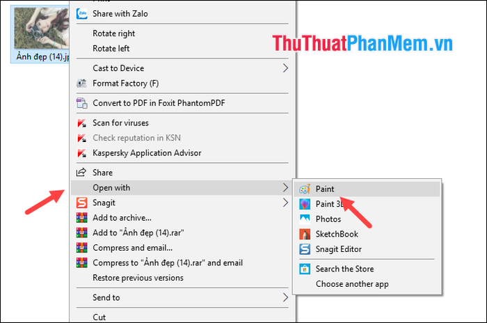 To add text with Paint, right-click on the image and choose Open with -> Paint
