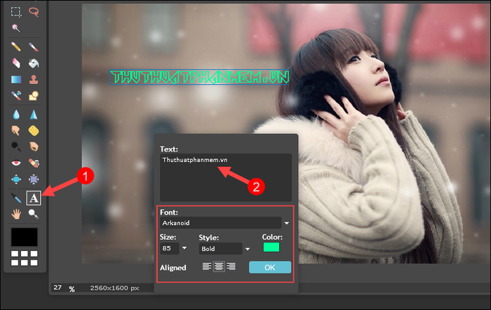 Step 2: After opening the image, select the letter A icon on the toolbar, then click on the image. A dialog box appears; enter text, choose font, font size, font style, and text color. After customization, click OK.