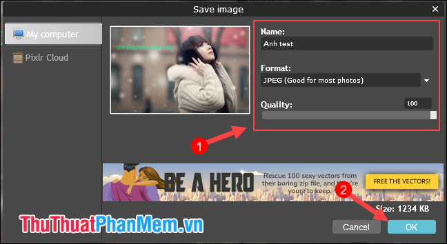 Step 4: The Save dialog appears; name the image, choose the image format, quality, and click OK.