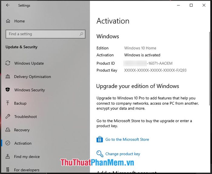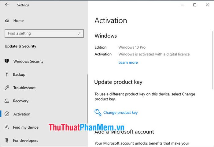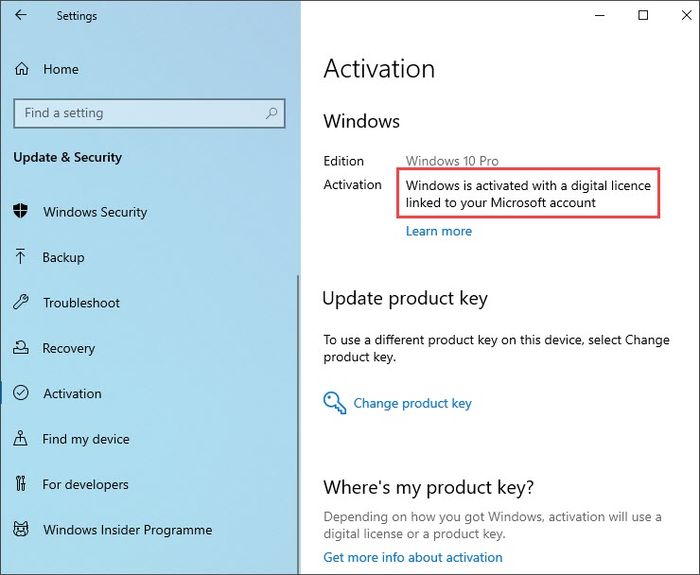 To activate your Windows 10 license, you can use either a product key or your Microsoft account, where your digital license is stored.