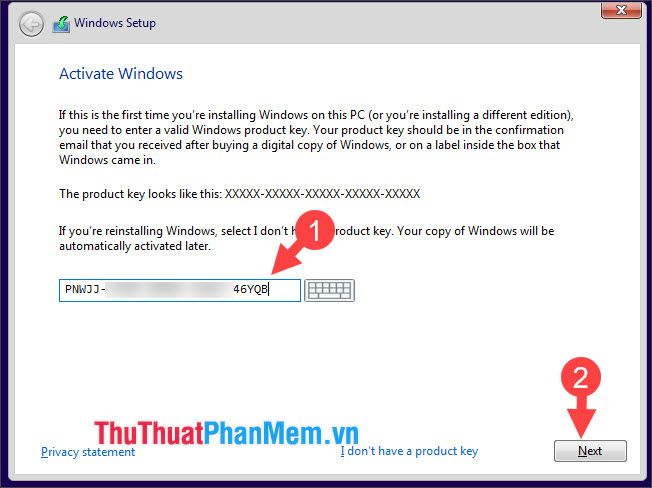 Step 3: Enter your license key (1) into the designated field => Next (2). Then proceed with the standard Windows installation steps.