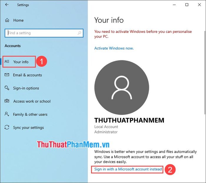 Step 3: Access Your info (1) => Sign in with a Microsoft account instead (2).