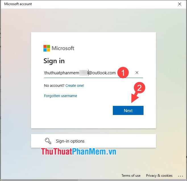 Step 4: Log in to your Microsoft account (1) => Next (2).