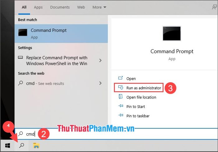 Step 1: Open cmd by clicking on Search (1) or using the Windows + S key combination => search with the keyword cmd (2) => Run as administrator (3).