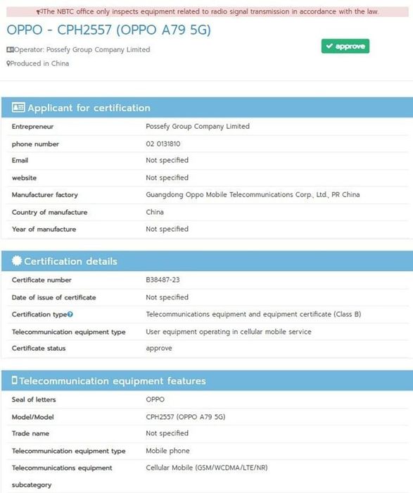 OPPO A79 5G obtains NBTC certificationAccording to the NBTC certification, the OPPO smartphone with model number CPH2557 will be introduced as OPPO A79 5G. Similar certifications from IMDA and TUV Rheinland disclose a 5,000mAh battery supporting 33W fast charging. The 3C certification reveals the device's dimensions at 165.61 x 76.02 x 7.99mm and a weight of approximately 193 grams.