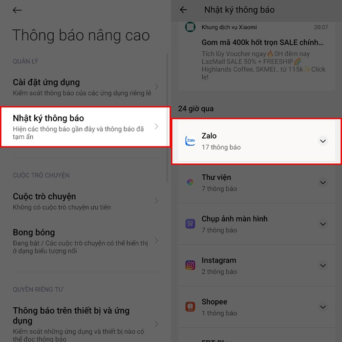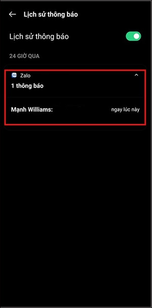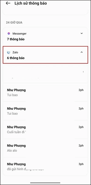 Step 2: Swipe the toolbar to the right to activate the notification log. After that, choose the Zalo app, click the downward arrow. Now, you can see the recalled messages.