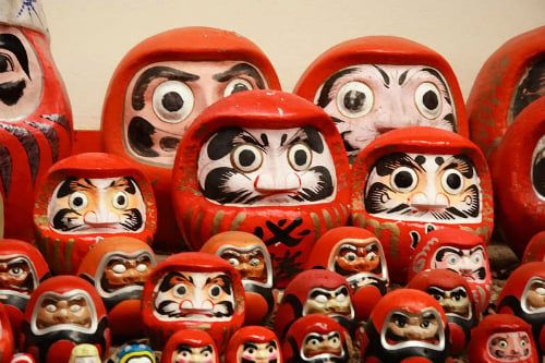 One of the popular souvenirs tourists often bring back from Japan is the Daruma doll. These are wooden dolls, round in shape, painted red, with large black lips and empty hollow eyes.