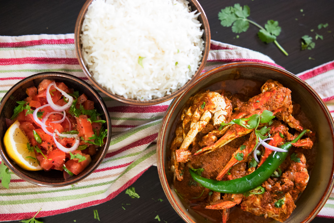 Serve the Crab Curry on a plate. Enjoy it hot with rice.