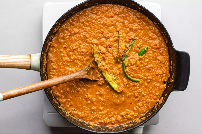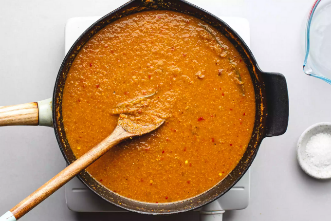 Put onions, tomatoes, dried red chili peppers, minced garlic and ginger, grated coconut, and all spices — cilantro powder, coriander powder, turmeric powder, and red chili powder — along with the tamarind water into a food processor and blend until smooth.
