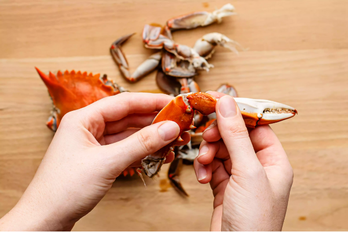 Separate the claws, joints, and crab body. Split the crab claws in half.