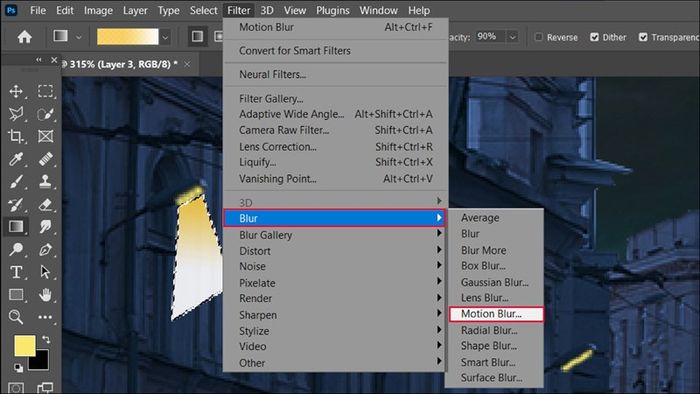 To make the light appear more realistic, select Filter > Blur > Motion Blur from the toolbar to blur the light.