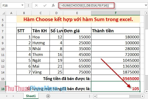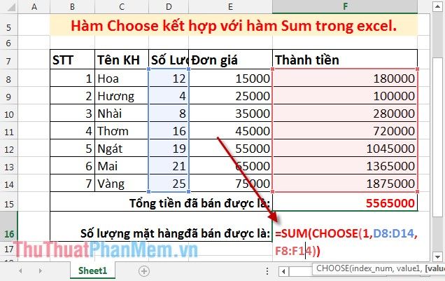 Paste the formula to sum the total value of index_num in the Choose function as 1: =SUM(CHOOSE(1,D8:D14,F8:F14)). Since the quantity column value is positioned at the 1st place among the values of the Choose function, Index_num =1.