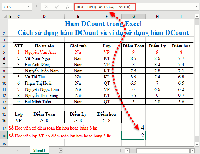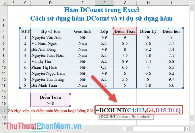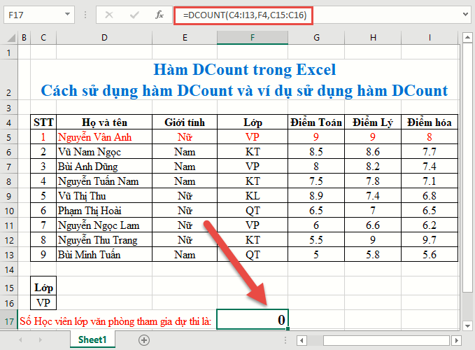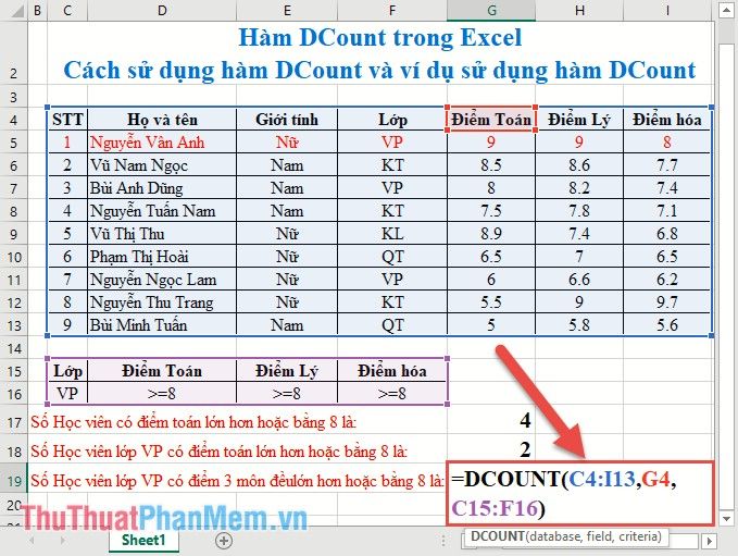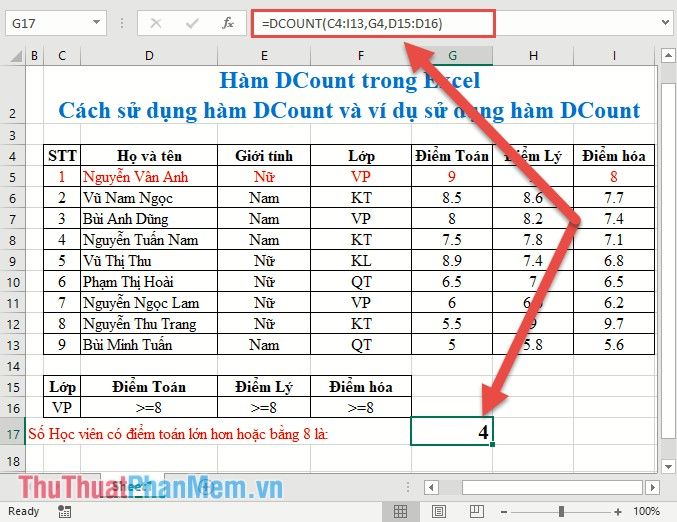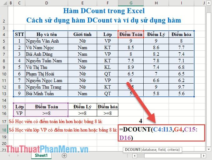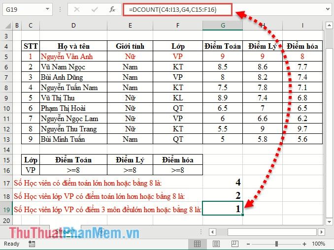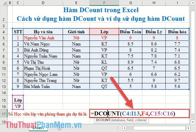 Count the total number of office students participating in the exam => condition range Class=VP. Enter the formula in the cell to count: =DCOUNT(C4:I13,F4,C15:C16)