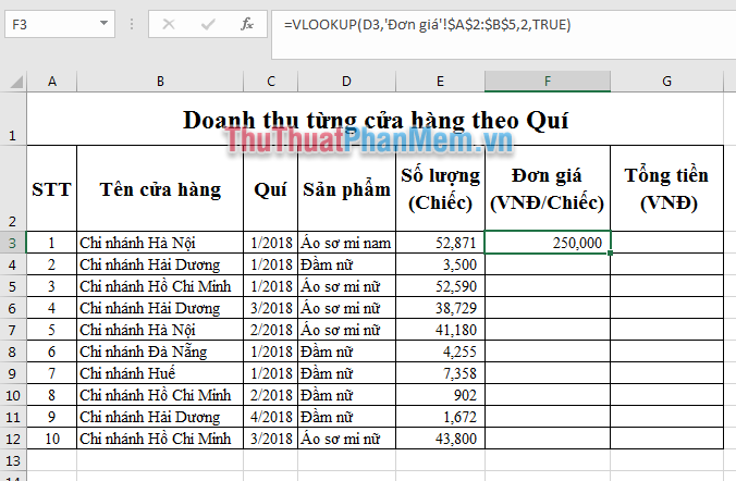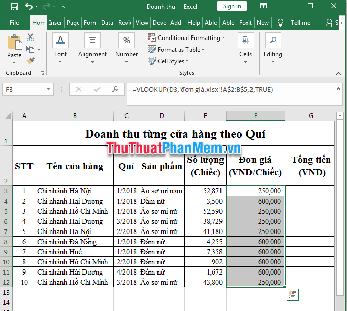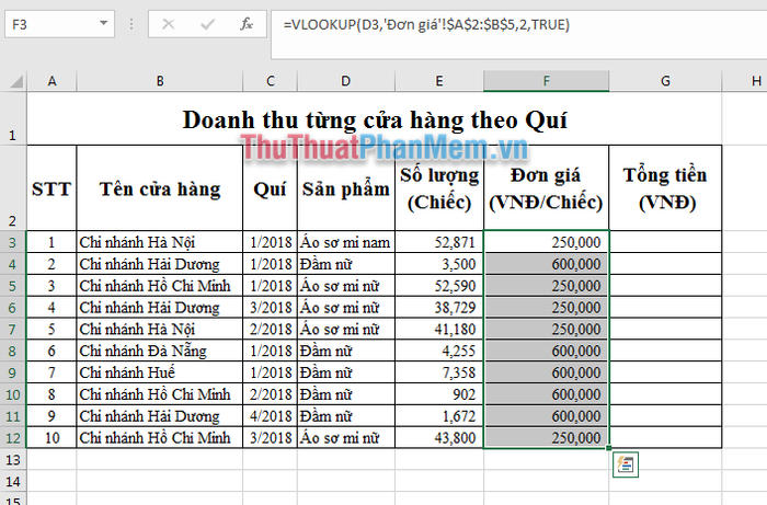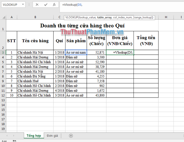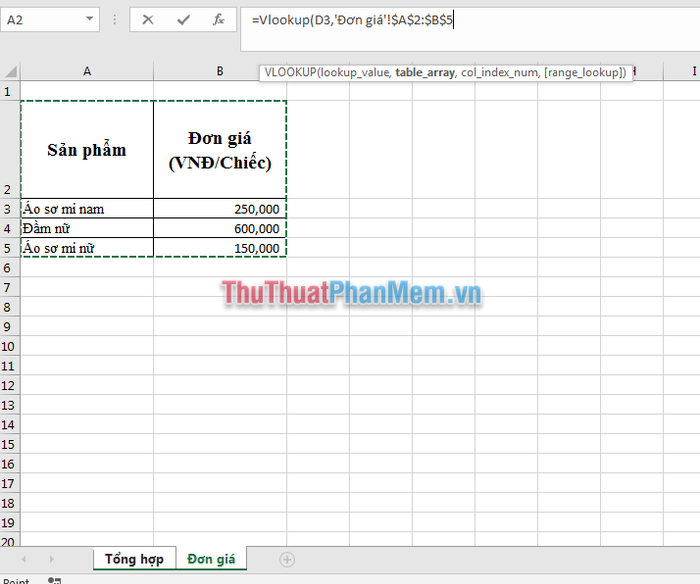 While keeping the entered formula unchanged, navigate to the Unit Price sheet and select the condition price range A2: B5. Press F4 to lock the cell references. The formula will become: =Vlookup(D3,'Unit Price'!$A$2:$B$5