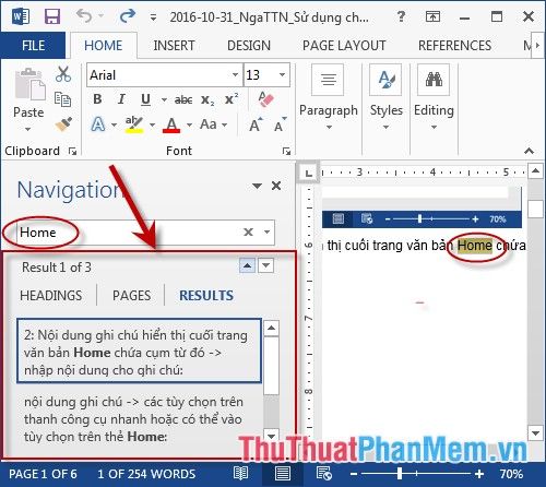Step 2: The Navigation dialog box appears. Enter the phrase you want to search -> press Enter -> the results are displayed: the total number of search results and each segment containing the search results (on the left side) along with displaying the content containing the search results on the right. Click on the arrow to navigate between the results: