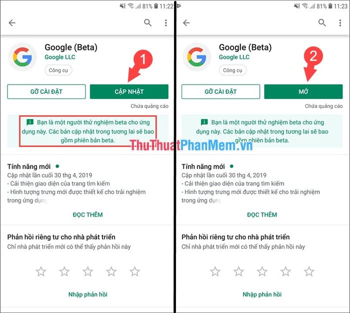 Step 3: Scroll up, and if you see the text You are a beta tester for this app. Future updates will include the beta version, it means you have successfully joined the beta program. Press Update to update the app to the latest version. Once the update is complete, press Open.