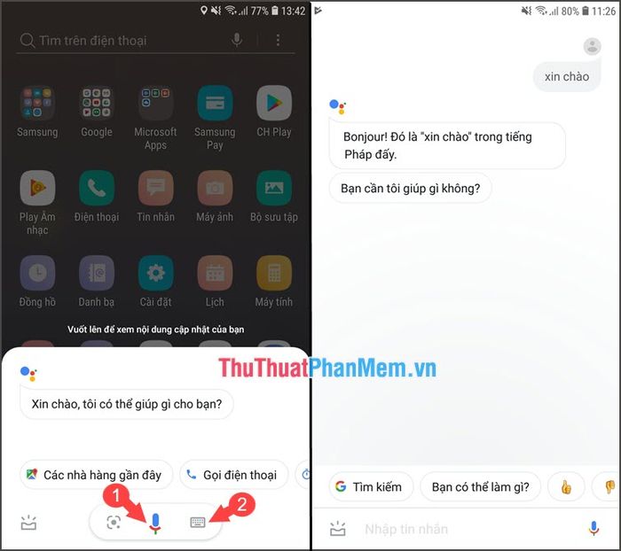 Step 6: Activate Google Assistant by holding down the home button for approximately five seconds. Once the virtual assistant appears, you can choose the Microphone icon (1) to command by voice or select the Keyboard icon (2) to manually input keywords. Afterward, let's test the virtual assistant with a greeting like 'Hello.'