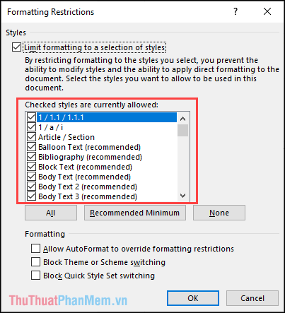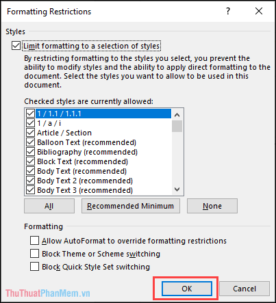 Step 4: When the Formatting Restrictions window shows up, choose the formats you don't want strangers to edit. These formats may include: Headings (1/ 1.1/ 1.1.1), bullets (1/ a/ i), and more.