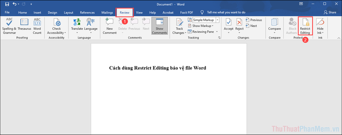 Step 1: Begin by selecting the Review (1) tab and choosing Restrict Editing (2) to activate protection mode in Word.
