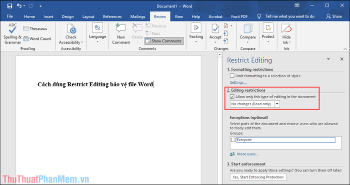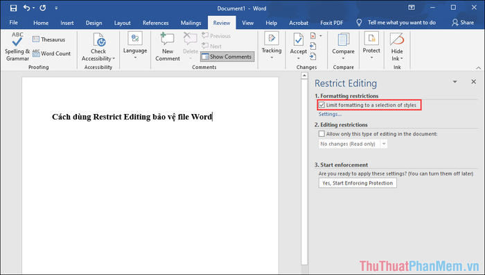 Step 5: Immediately, the Restrict Editing section will appear, presenting you with 3 options as follows: