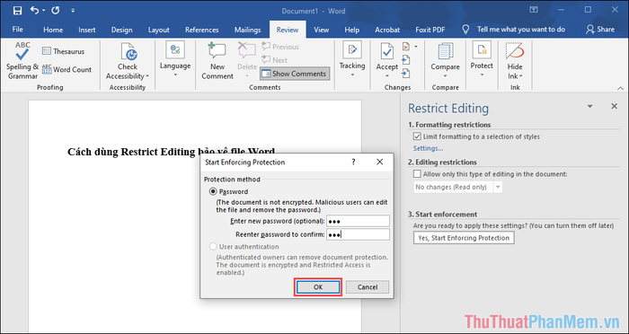 Step 8: The current method for document protection involves using a character password. Input your password in the Password section for confirmation. Finally, click OK to complete the process.