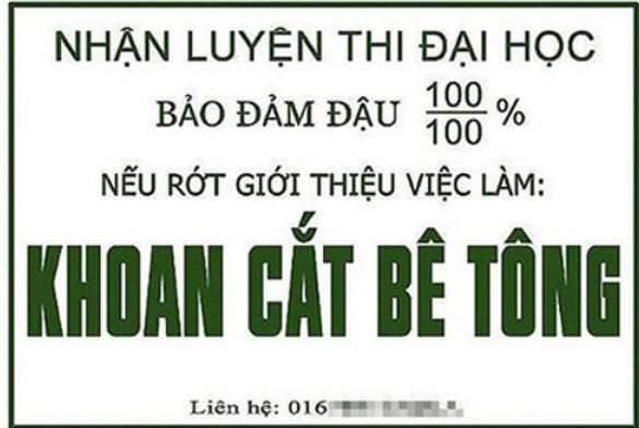 'What should I do if I fail the university entrance exam?' is a question many students ask as they face their college entrance exams. It seems that diligent and effective preparation is key to passing. However, many students are overwhelmed by the sea of exam prep advertisements, unsure of which to choose. The following photo might just showcase the most unbelievable exam prep advertisement in Vietnam. Offering a 100% pass rate and job placement, yet no student dares to enroll. After seeing this ad, many youths exclaimed, 'Why isn't there a university for concrete drilling and cutting????'